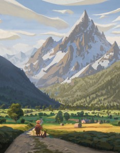 山谷之上的山 小路 戴帽子的小孩 狗 麦田 插画风景4k壁纸