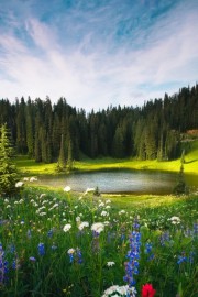 高山 湖水 树林 鲜花风景手机壁纸图片