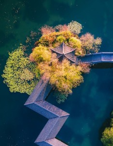 俯视 湖 亭子 树 桥 风景手机壁纸