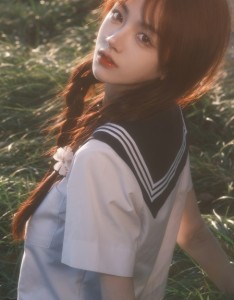 户外 坐在草地的美女 水手服 回头 手机壁纸