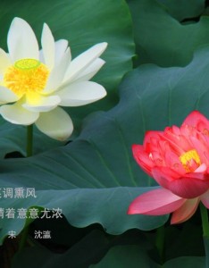 池塘里二朵一红一白莲花