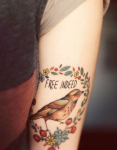 女人腿部潮流时尚的音符与小鸟藤蔓纹身图案