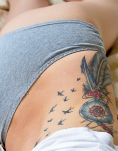 女生腰部小鸟捕梦网彩色性感刺青图案