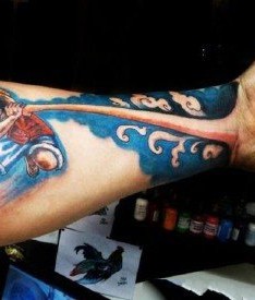 男生手臂上彩绘抽象线条动漫人物海贼王路飞纹身图片