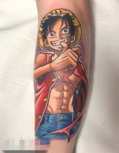 男生手臂上彩绘抽象线条动漫人物海贼王路飞纹身图片