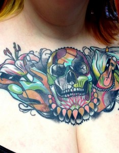 上一篇:胸部new school彩色骷髅花卉纹身图案