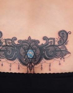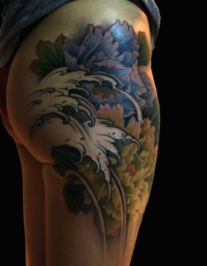 女子侧臀部鲤鱼法蒂玛之手纹身图片
