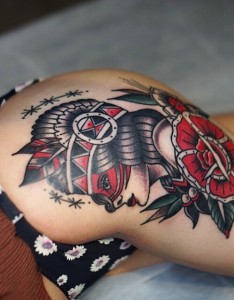 女子侧臀部鲤鱼法蒂玛之手纹身图片