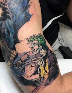 手臂漫画风格的彩色蝙蝠侠和小丑纹身