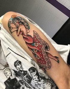 男子左手臂上传统的跳舞的性感女人纹身图片