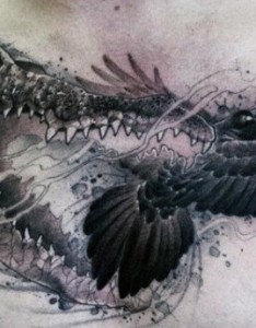 胸部令人印象深刻的黑灰鳄鱼与乌鸦纹身图案