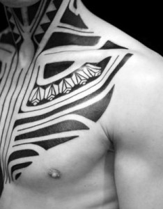 胸部黑灰飞行乌鸦与枫叶纹身图案