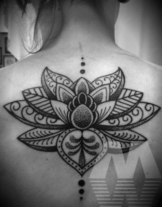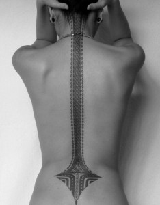 女子背部脊椎骨上的线条和蜜蜂纹身图片