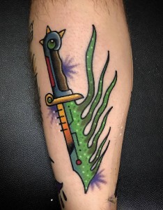 欧美小腿纹身 男生小腿上彩色的匕首纹身图片