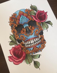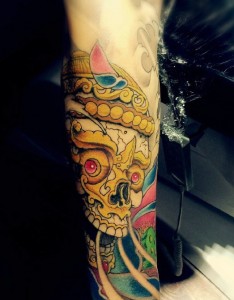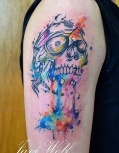 大臂彩色泼墨嘎巴拉骷髅纹身图案
