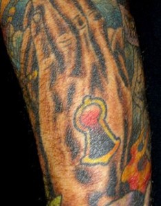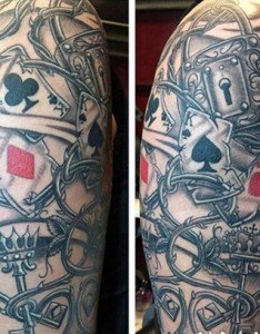 肩部华丽的彩色钥匙锁与扑克牌纹身