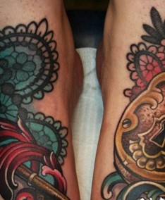 脚部彩色奇妙的金色锁与钥匙纹身图片