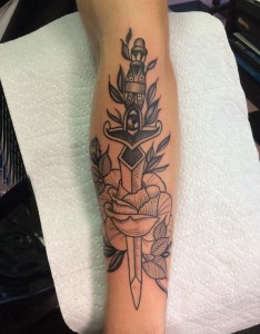 欧美匕首纹身男生手臂上花朵和匕首纹身图片