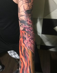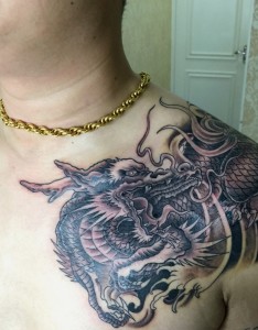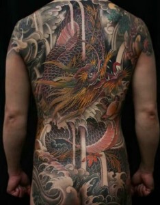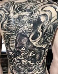 霸气无敌的满背彩色大邪龙海浪纹身图案