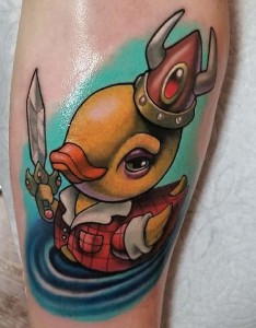 纹身卡通 女生小腿上彩色的橡皮鸭纹身图片