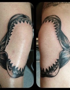 腿部黑色鲨鱼大嘴纹身图案