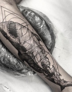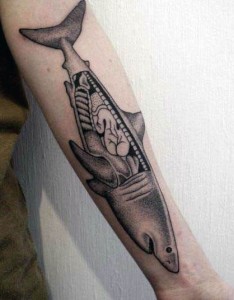 小臂点刺风格黑色大鲨鱼和内脏纹身图案
