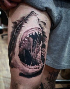 大腿惊人的黑色逼真鲨鱼头纹身图案