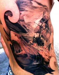 侧肋惊人的黑灰大鲨鱼和帆船纹身图案