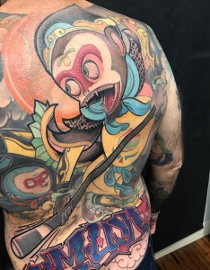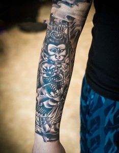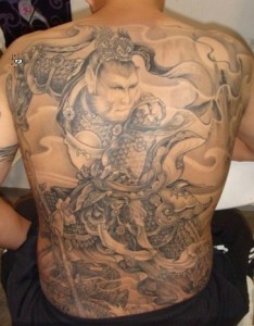 黑灰色大面积纹身龙头和斗战胜佛纹身图案