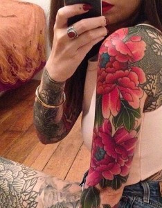 女生满身日式彩色纹身图案非常狂野