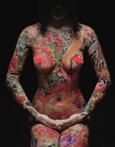 女生满身日式彩色纹身图案非常狂野