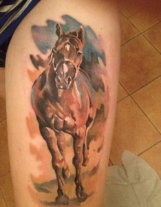 女性腰侧彩色逼真的马与玫瑰纹身图片