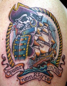 肩部彩色海盗骷髅和旧船纹身图片