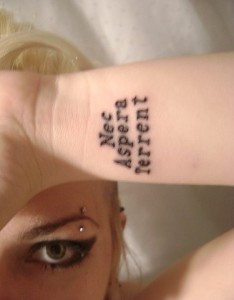 手臂黑色刀剑与拉丁文纹身图案