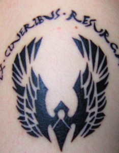 肩部黑色凤凰与拉丁文纹身图片