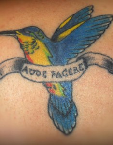 背部彩色拉丁文字与蜂鸟纹身图片